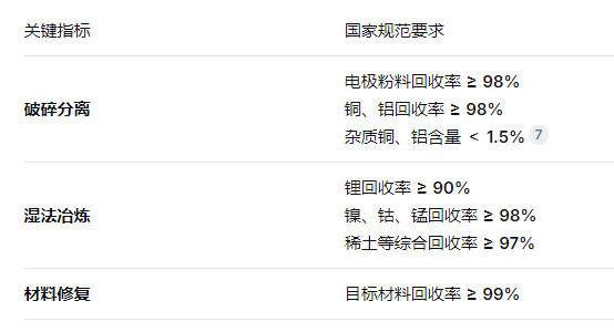 關于鋰電池的回收率和回收純度,目前國家已制定了明確的行業規范,工業和信息化部發布的 《新能源汽車廢舊動力電池綜合利用行業規范條件(2024年本)》 ,為正規企業設定了明確的準入門檻